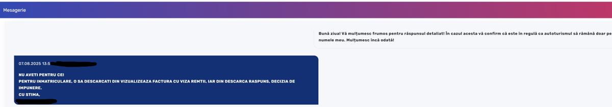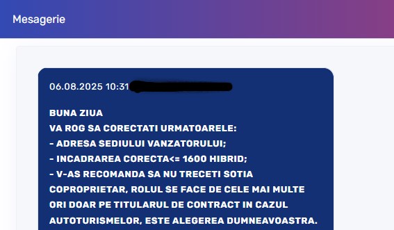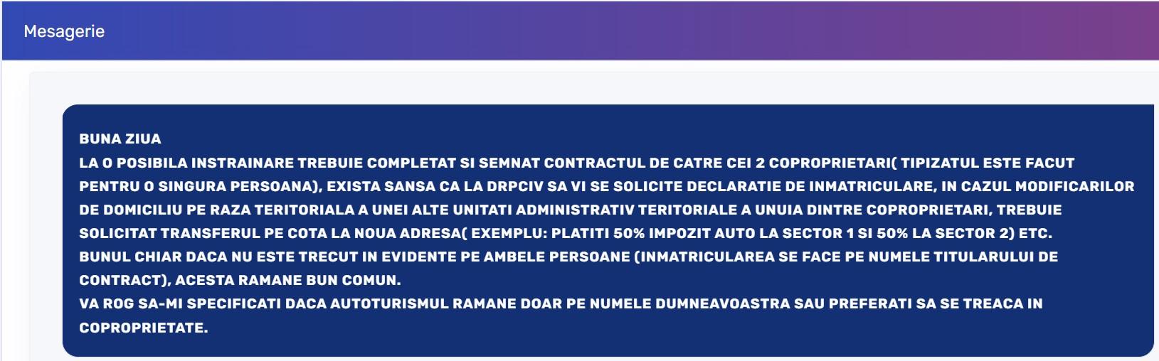 La înregistrarea mașinii noi sunt mai multe acte de depus. Le-am depus tot în week-end și luni dimineață am primit mesaj în platformă. Completasem eu ceva greșit, iar mesajul doamnei care lucrează acolo a venit și cu o recomandare, aceea de a nu trece și soția drept coproprietar.