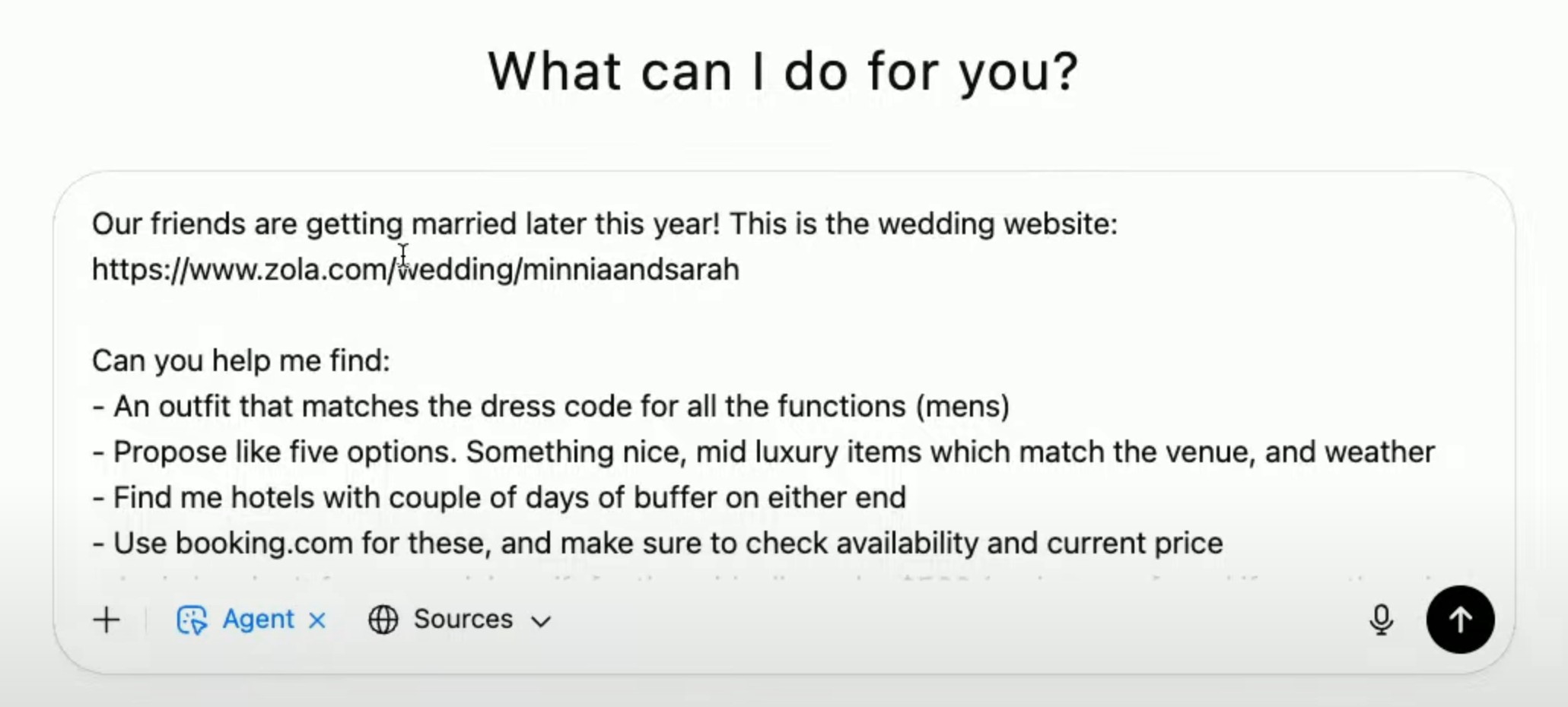 În prezentare, unul dintre cei de la OpenAI îl folosește pentru a planifica participarea la o nuntă. Îl roagă pe agent să-i găsească o ținută care să fie potrivită pentru eveniment și pentru vremea de afară, să îi găsească locuri la hotel și să găsească și un cadou pentru miri.