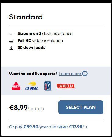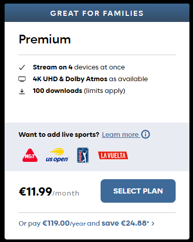 Așadar, pentru a avea calitate 4K și Dolby Atmos plus streaming simultan pe 4 device-uri, trebuie achitat 12€ lunar.