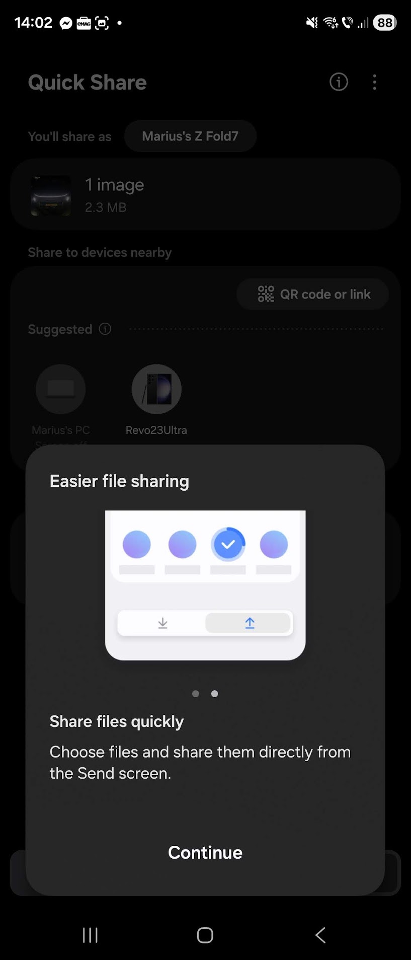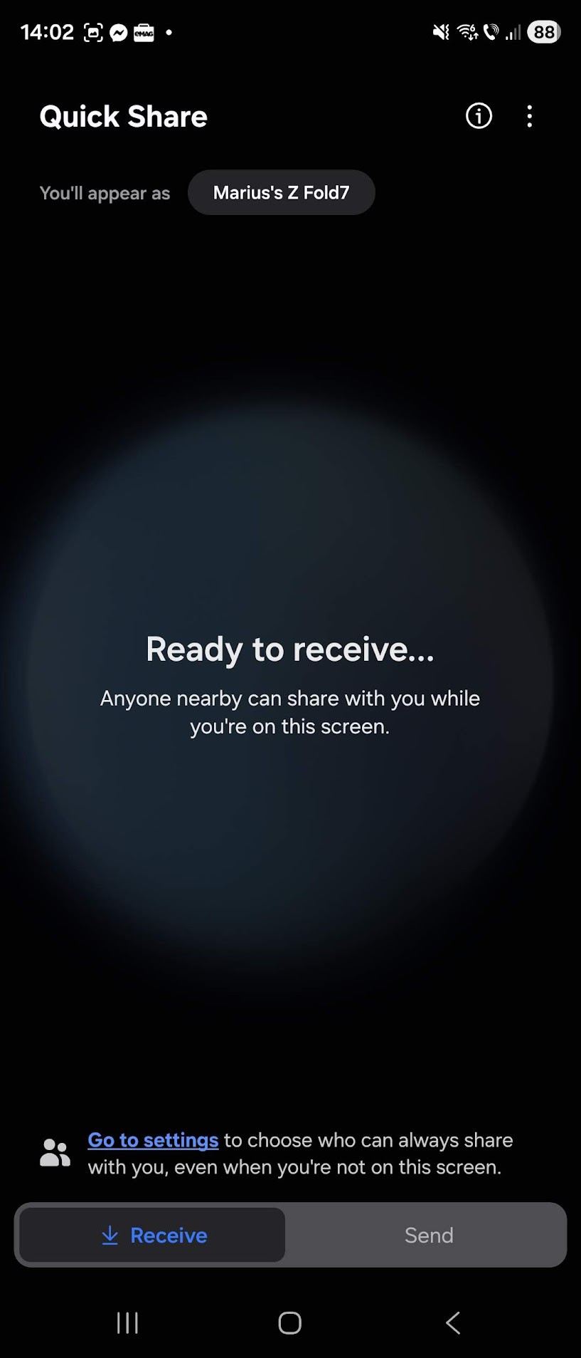Unul dintre ele ar fi un mod mai ușor de a trimite fișiere prin QuickShare. Dacă intri în aplicație și comuți pe ecranul de “receive”, îți poate trimite oricine fișiere, nu mai este nevoie de PIN-uri și Accept-uri.