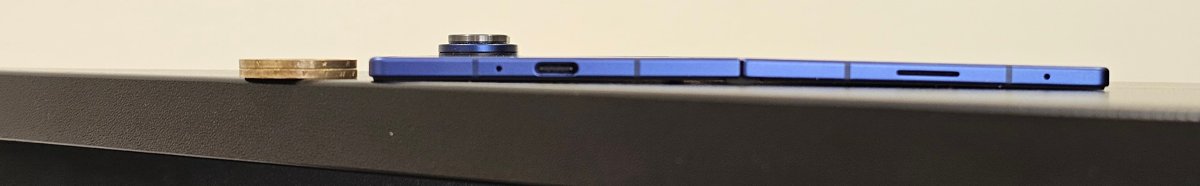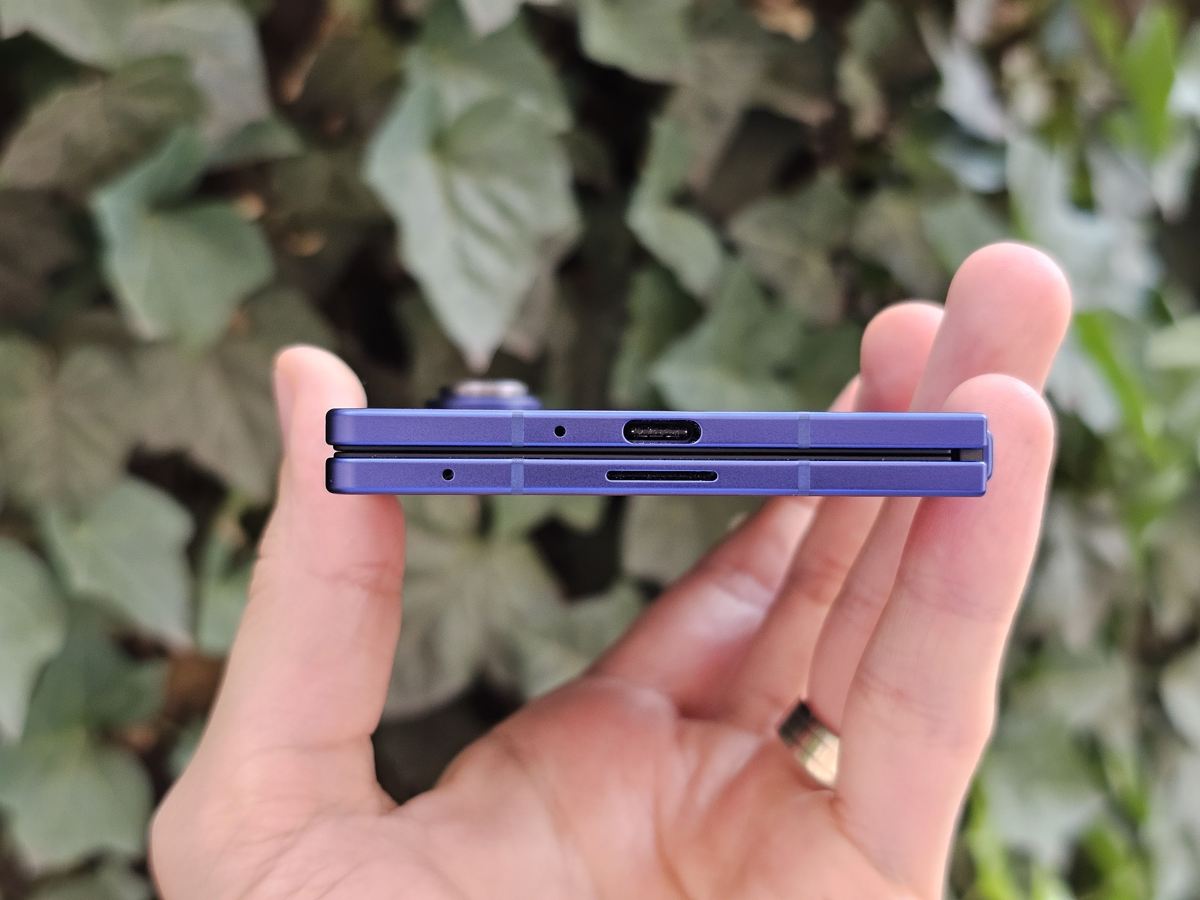 Deschis deja devine periculos de subțire. Are doar 4,2 mm grosime, adică un pic mai mult decât două monede de 50 de bani puse una peste alta. Mi se pare că telefonul se duce deja într-o extremă în care dacă îl fac un pic mai subțire, va deveni greu de prins cu buricele degetelor pentru a fi desfăcut. Bine, nu cred că se poate mai subțire de atât, pentru că nu s-ar mai putea integra portul USB-C pentru încărcare.