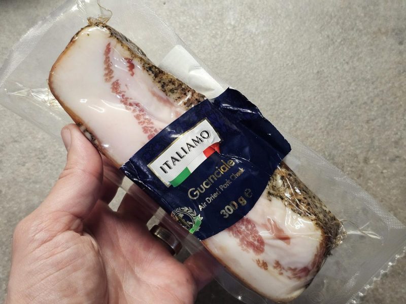 Ce am mai cumpărat? Guanciale! 25 lei pentru 300 de grame este un preț bun. Am căutat o bucată cu mai multă carne printre grăsime.