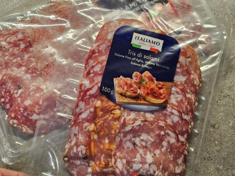 Și am luat și niște salam, să fie. Am găsit un trio de salam cu usturoi, ventricina picant și …. eh… al treilea nu știu ce este. Am luat și mozzarella și rucola. Plănuiesc să cumpăr niște pâine bună de la brutăria de lângă noi și să fac un mega panino cu salam, mozzarella, rucola și un pic de ulei de măsline.